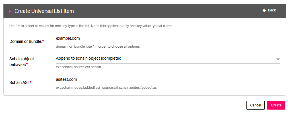 Schain ASI. Enter the ASI value used in your schain object, for example: asitext.com
