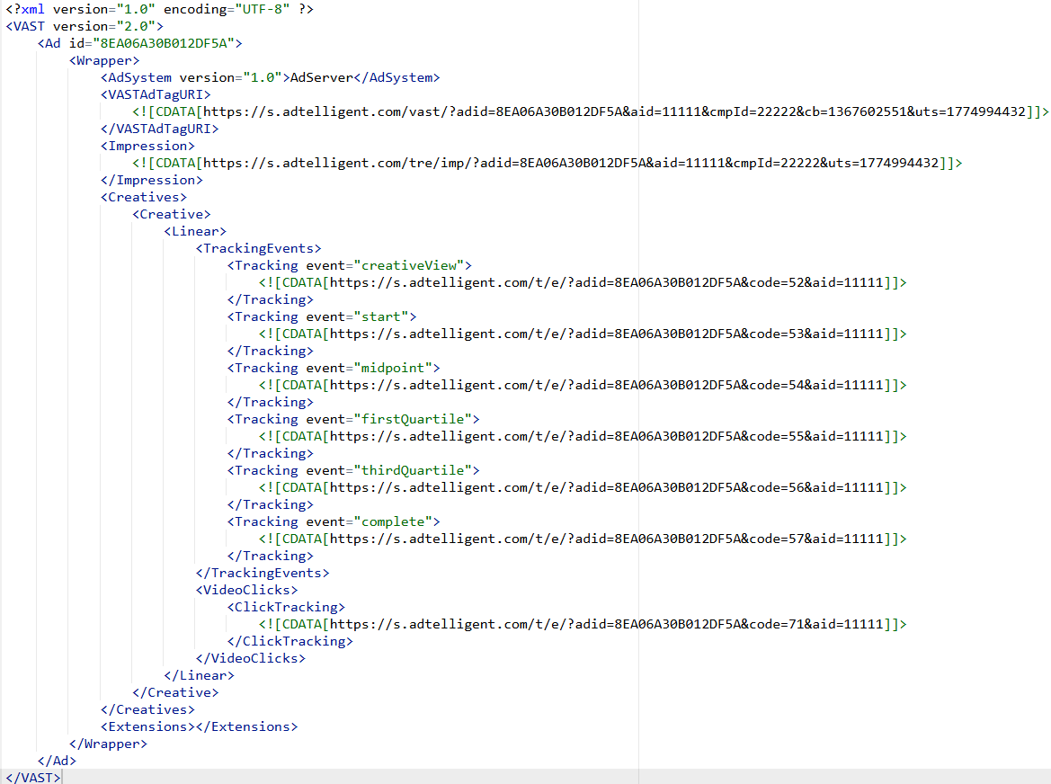 The publisher receives a VAST XML with a wrapper pointing to the campaign.